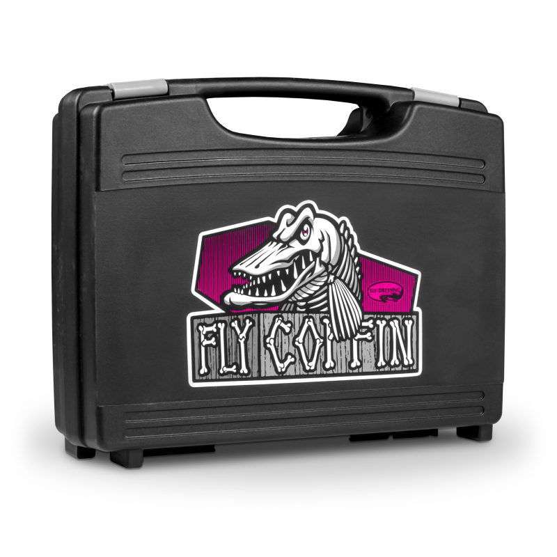Laatikko on valmistettu muovista, ja siinä on kahvat, nepparilukot ja sarana. Sisäpuoli on vaahtomuovia, mutta toisin kuin muissa laatikoissa, joissa on sileä vaahtomuovi, Fly Coffin -laatikossa on uritettu vaahtomuovi, jossa koukun kärki kulkee rataa pitkin ja pitää näin kärpäsen paikallaan. Varustettu vaahtomuovilla sekä kannessa että pohjassa.