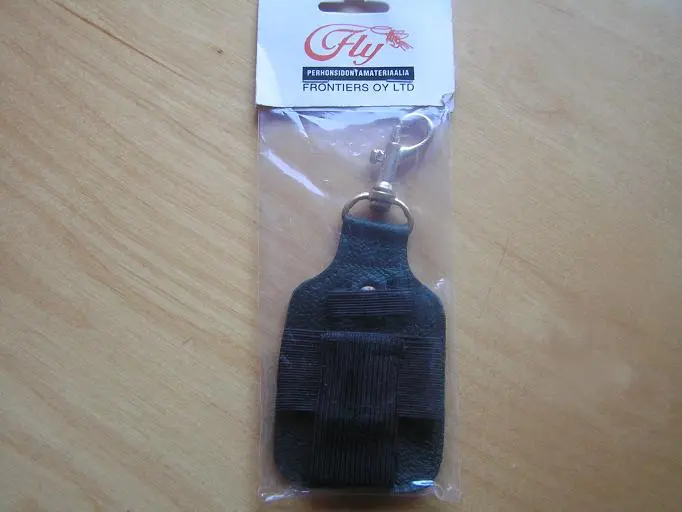 Fly:n ripustin, vaikka Visionin perhonkellunta-ainepurkille. Kestävä messinkinen lukko, nahkainen rakenne ja kestävä kuminauha.